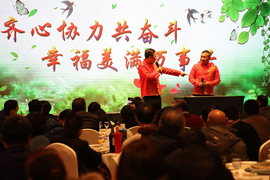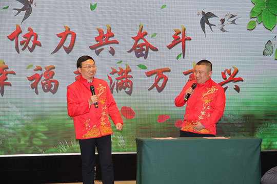 由阿彬主任、副總工阿杰自編自演的相聲《幸福三圣》,再現了洋溢在三圣集團大家庭中的濃濃幸福氛圍。這篇原創的相聲題材,傾注了編者的智慧和用心,巧妙將2018年度三圣大事件貫穿其中,詼諧幽默,“包袱”連連,獲得滿堂喝彩,兩位相聲演員也被贊“三圣德云社”;