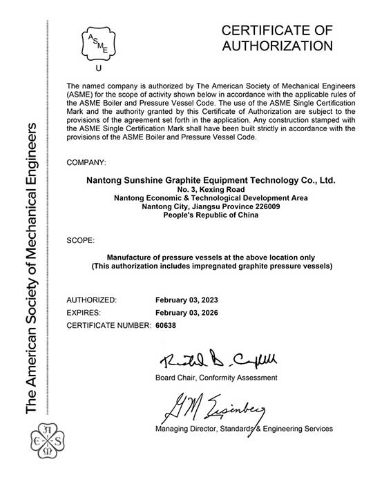 獲得ASME “U”鋼印認(rèn)證標(biāo)志著南通三圣在石墨設(shè)備制造方面的實(shí)力得到了國(guó)際權(quán)威的認(rèn)可。這不僅體現(xiàn)了公司在研發(fā)、生產(chǎn)和質(zhì)量控制方面的優(yōu)秀表現(xiàn),也是對(duì)公司持續(xù)創(chuàng)新和環(huán)保理念的有力證明。