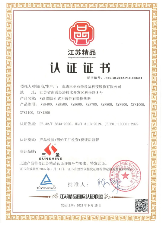 經“江蘇精品”國際認證聯盟認證,南通三圣石墨設備科技股份有限公司榮膺“ 江蘇精品 ”認證 ,成功躋身“江蘇精品”優質制造業品牌。