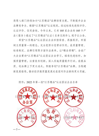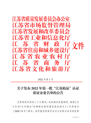 “江蘇精品”是江蘇省為推動形成一批自主創新、品質高端、服務優質、信譽過硬、市場公認的“江蘇精品”品牌群體,以行業龍頭骨干、“專精特新”和“單項冠軍”等企業為主體認證對象,參照國際慣例、運用市場機制,由江蘇省市場監管局會同省發改委等七部門開展的重點認證工作。